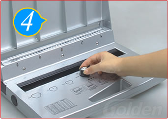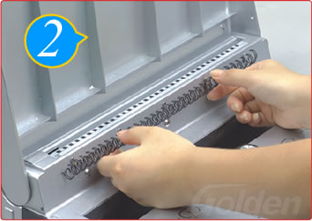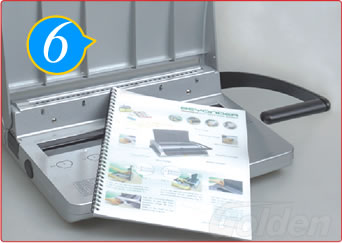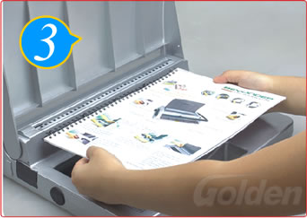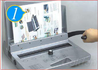 將套好鐵圈的文本放進(jìn)裝訂槽,開口朝下,壓下手柄將鐵圈咬合整齊。