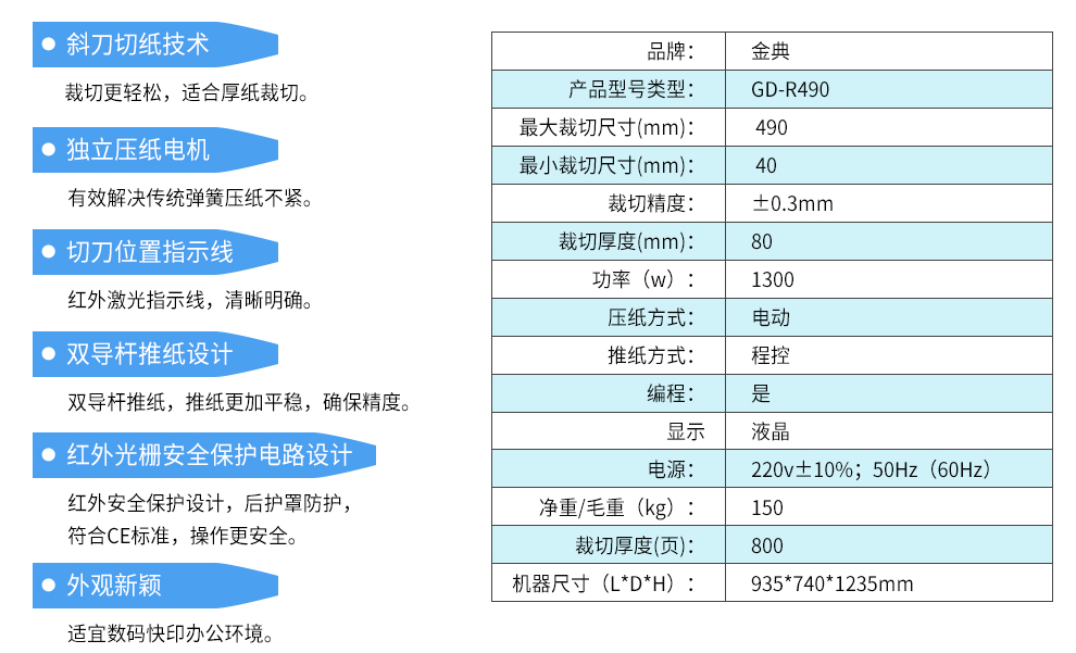 照片容量: 金典 操作方式: GD-R490 最大塑封尺寸(mm): 490mm 最大塑封厚度(mm): 80mm(800頁) 輸入功率(W): ±0.3mm 輸入電壓(V): 電動 輸入電流: 程控 預(yù)熱時間: 支持 機器尺寸(mm): 液晶顯示 凈重/毛重(kg): 220v±10% 過塑溫度: 1400w 膠輥直徑: 935×740×1235mm 膠輥數(shù)量: 150/190kg 過塑寬度: 950×750×1250mm 毛重(kg): 電動程控切紙機 凈重(kg): 40mm