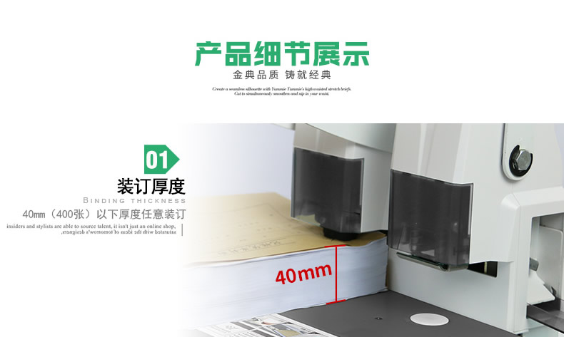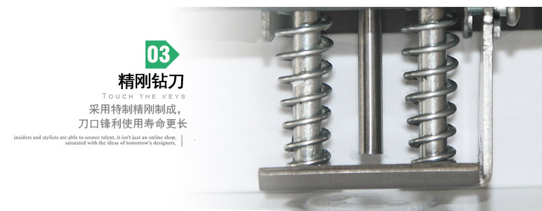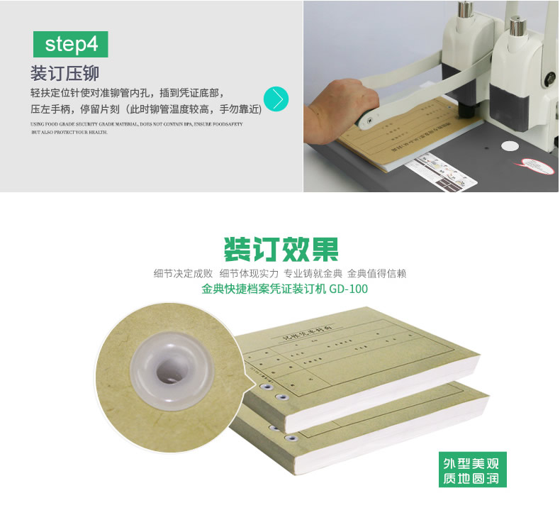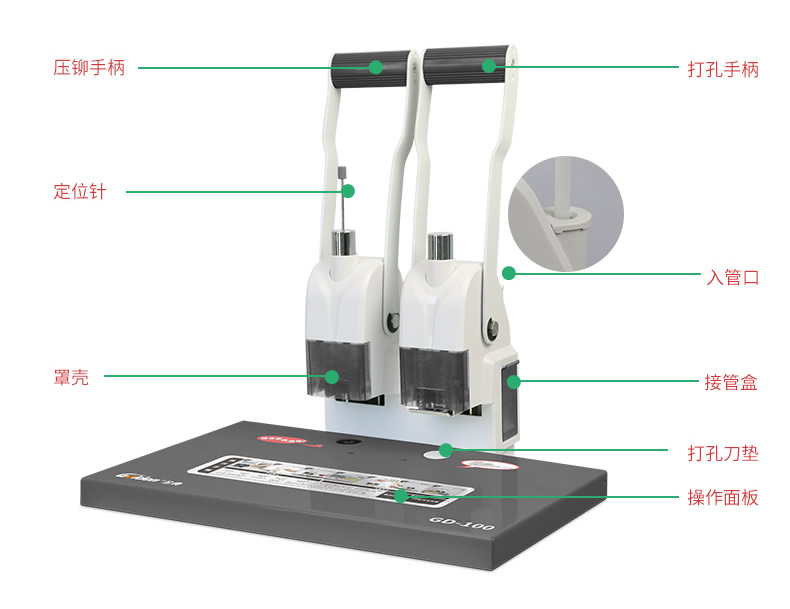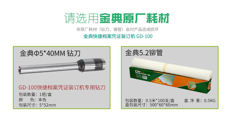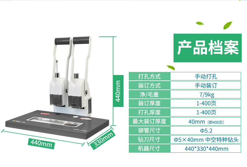 產(chǎn)品類型: 金典 產(chǎn)品特性: GD-100 匹配耗材: 手動(dòng) 功率: 220v±5% / 50hz 打孔方式: 60W 裝訂方式: Φ5*40 可裝訂材料: Φ5.2 連續(xù)工作時(shí)間: 6.0kG/8.4KG 工作溫度(℃): 434mm*320mm*438mm (手柄壓下后高度為272mm) 毛重(kg): 495mm*365mm*395mm 機(jī)器凈尺寸(mm): 1-40mm 外包裝尺寸(mm): 手動(dòng)