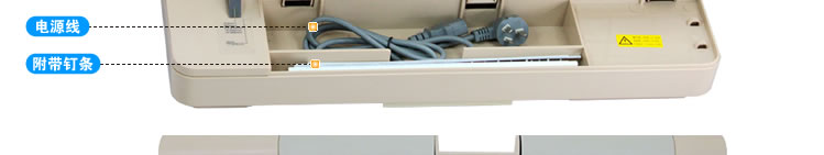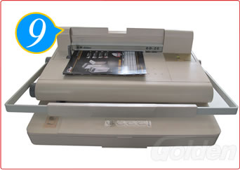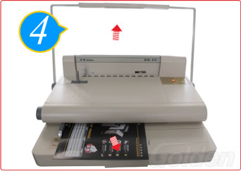 此時(shí)順時(shí)針抬起手柄至最高位置,蜂鳴聲停止,電源指示燈(紅色)繼續(xù)發(fā)光,拉起壓條使之回到壓條座內(nèi),電源指示燈(紅色)滅,取出裝訂好的文本,機(jī)器回到初始狀態(tài)。