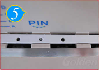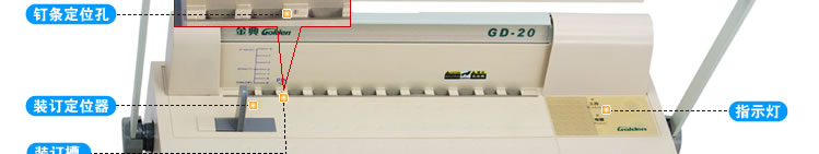 打開(kāi)電源開(kāi)關(guān),將孔式裝訂放入主機(jī)面板上的裝訂槽中,使定位銷(xiāo)釘插入銷(xiāo)孔之中并且放平,帶沉孔的一面朝下放。