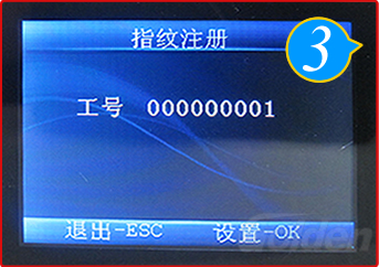 第三步:指紋注冊,輸入工號跟姓名,然后按提示錄入三次指紋,最后按OK鍵確認成功登記。