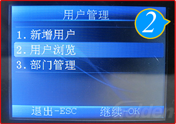 第一步:按"MENU"鍵進入操作菜單,選擇"用戶管理"按"OK"鍵。