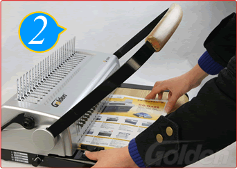 將手柄慢慢地往上推至拉圈打開,然后將紙張孔插入拉圈內(nèi),將手柄慢慢往回拉,讓拉圈齒全部插進(jìn)紙張孔后,將手柄拉到位,收緊拉圈口。