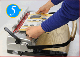 根據(jù)紙張數(shù)量,選擇大小不同規(guī)格的拉圈,將手柄慢慢地往上推至拉圈打開,然后將紙張孔插入拉圈內(nèi),將手柄慢慢往回拉,讓拉圈齒全部插進(jìn)紙張孔后,將手柄拉到位,收緊拉圈口,裝訂本就裝好了