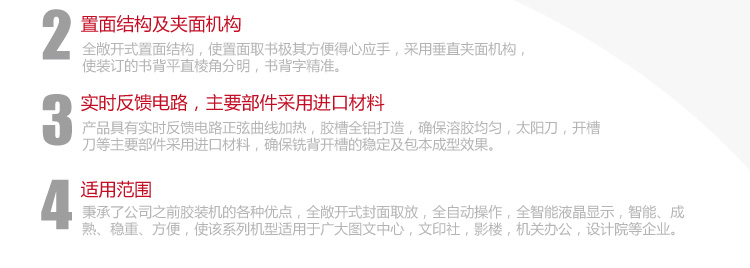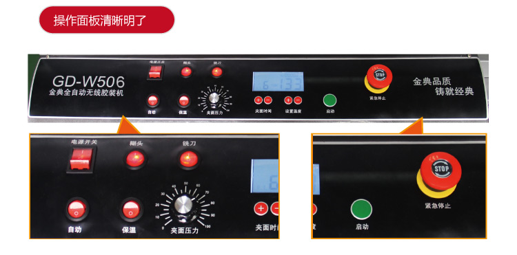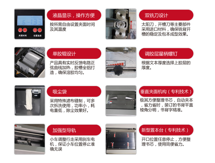 松開調(diào)節(jié)膠層的星柄螺釘,根據(jù)裝訂書本的厚薄來調(diào)節(jié)上膠層,按“啟動(dòng)”鍵,夾本小車從左向右運(yùn)動(dòng),經(jīng)過銑刀銑背、開槽,再上膠。